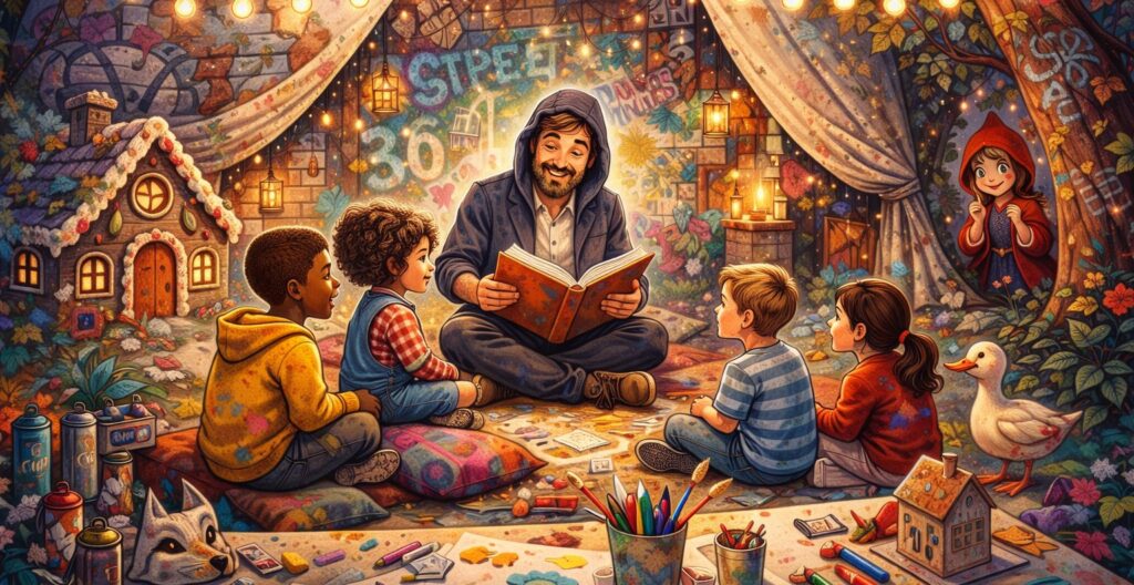 I vores fortællerhule vil Kasper Sørensen levende fortælle to udvalgte klassiske eventyr fra Hans og Grete, Rødhætte og Ulven, Den grimme Ælling og Emil fra Lønneberg.